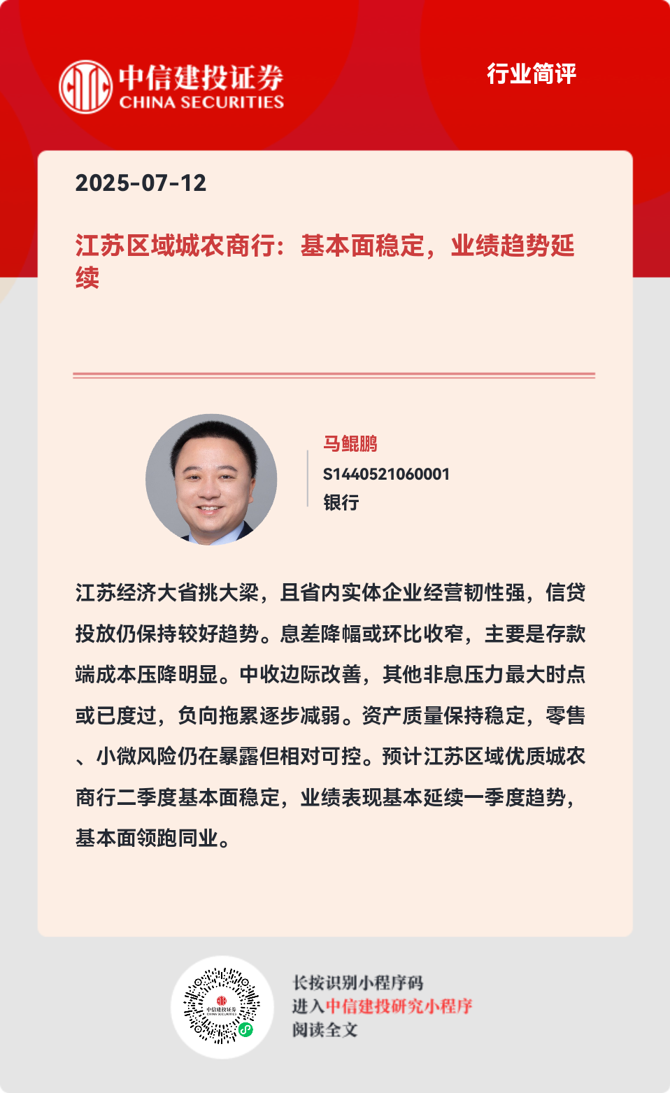 江苏省经济发展动能依然强劲:一方面在“经济大省挑大梁”的政策导向下,政府项目、涉政平台类信贷需求仍然保持相对旺盛,对公信贷投放有保障。另一方面,江苏省实体企业的经营活力和经营韧性都较强。面对“关税战”冲击,江苏省民营企业家普遍保持定力并积极寻求转型,并未出现所谓“躺平”思维。 另一方面,江苏省经商环境优异,政府开明且敢于创新,积极为本土企业提供有效的帮助和补贴,也通过招商引资吸引了大批省外新兴产业和专精特新小企业,弥补了外资流出的空白。涉政+实体共同支撑下,江苏区域优质城农商行的信贷需求仍相对全国更加旺盛。零售方面,由于房市仍相对低迷,市场按揭需求并未明显回暖。但部分地区二手房按揭需求有所增长, 银行通过与房屋中介平台合作引流客群,贡献部分按揭增量。叠加提前还款现象的减少,按揭规模保持稳中有升的趋势。此外,小额消费贷、互联网贷款和经营贷投放有所增长,二季度零售贷款投放实现边际改善。综合来看,预计江苏地区优质城农商行规模增长有望延续较快增长,实现“以量补价”。