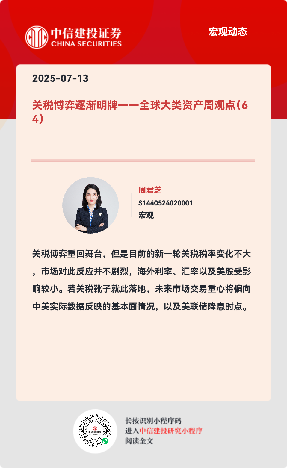 周君芝:浙江大学经济学博士,现任中信建投证券首席宏观分析师。