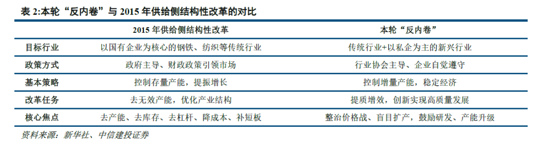 发展目标方面,新一轮“反内卷”的主要目标不仅包括在前两轮供给侧改革中居于核心地位的、以国有企业为核心的钢铁、纺织等传统行业,也包括新能源、电动汽车、光伏等发展较快、民营企业主导的新兴行业;不仅旨在退出传统行业的过剩产能,而且注重全方位提升国内核心竞争力,引导企业从“数量竞争”迈向“质量提升”。