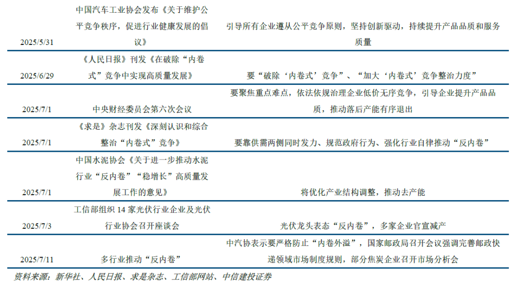 2024年7月30日,中共中央政治局召开会议,会议指出,要防止“内卷式”恶性竞争,这是历次政治局会议中首次用“内卷”描述行业竞争。会议强调,要有力有效支持发展瞪羚企业、独角兽企业。要强化行业自律,防止“内卷式”恶性竞争。此后,2024年12月,中央经济工作会议上提到,2025年的九大重点任务之一,就是“以科技创新引领新质生产力发展,建设现代化产业体系”,这要求我们综合整治“内卷式”竞争,规范地方政府和企业行为。积极运用数字技术、绿色技术改造提升传统产业。2025年2月25日,市场监管总局召开部分企业公平竞争座谈会,围绕整治“内卷式”竞争提出了具体建议。3月5日的政府工作报告在提到纵深推进全国统一大市场建设时说,要加快建立健全基础制度规则,破除地方保护和市场分割,打通市场准入退出、要素配置等方面制约经济循环的卡点堵点,综合整治“内卷式”竞争,为“反内卷”划定了具体行动路线。此后,多家官媒多次发布“反内卷”相关文章,5月26日,《人民日报》发表《反“内卷”该出手时就出手》,指出监管者应“该出手时就出手”,同时应引导平台企业摒弃打价格战这种“内卷式”竞争,打开思路,从争夺存量转向创造增量,加强技术创新,重视差异化发展,回归到良性竞争的正途。5月31日,中国汽车工业协会对外发布了《关于维护公平竞争秩序,促进行业健康发展的倡议》,旨在引导所有企业遵从公平竞争原则,坚持创新驱动,持续提升产品品质和服务质量,共同维护行业健康发展。6月29日,《人民日报》在头版刊发了署名“金社平”的文章《在破除“内卷式”竞争中实现高质量发展》,举例了部分行业无序价格战的乱象:“光伏组件低至每瓦六毛多,百余款车型加入降价行列,储能系统中标价格屡创新低……”,并指出了“内卷式”恶性竞争的弊端:“会削弱行业整体竞争力”、“会破坏产业发展生态”、“会阻碍国内大循环”,提出要“破除‘内卷式’竞争”、“加大‘内卷式’竞争整治力度”。